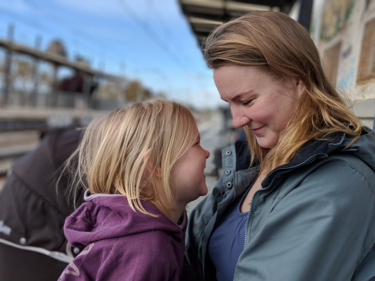 Der Zug war leider so voll, dass wir alle bis auf Louisa die im Kinderwagen lag stehen mussten. Amélie hat das echt klasse gemacht! Die Fahrt war recht spannend, da die Bahnschienen direkt am Wasser entlang führen.