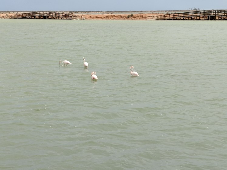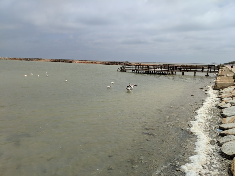 Es ist wirklich schön angelegt, von der Promenade liegt auf der einen Seite der Salzsee und auf der anderen Seite befindet sich ein kleiner Strand. Zum Salzsee gibt es mehrere Zugänge über kleine Stege und dort waren eine ganze Menge Flamingos am baden und essen.