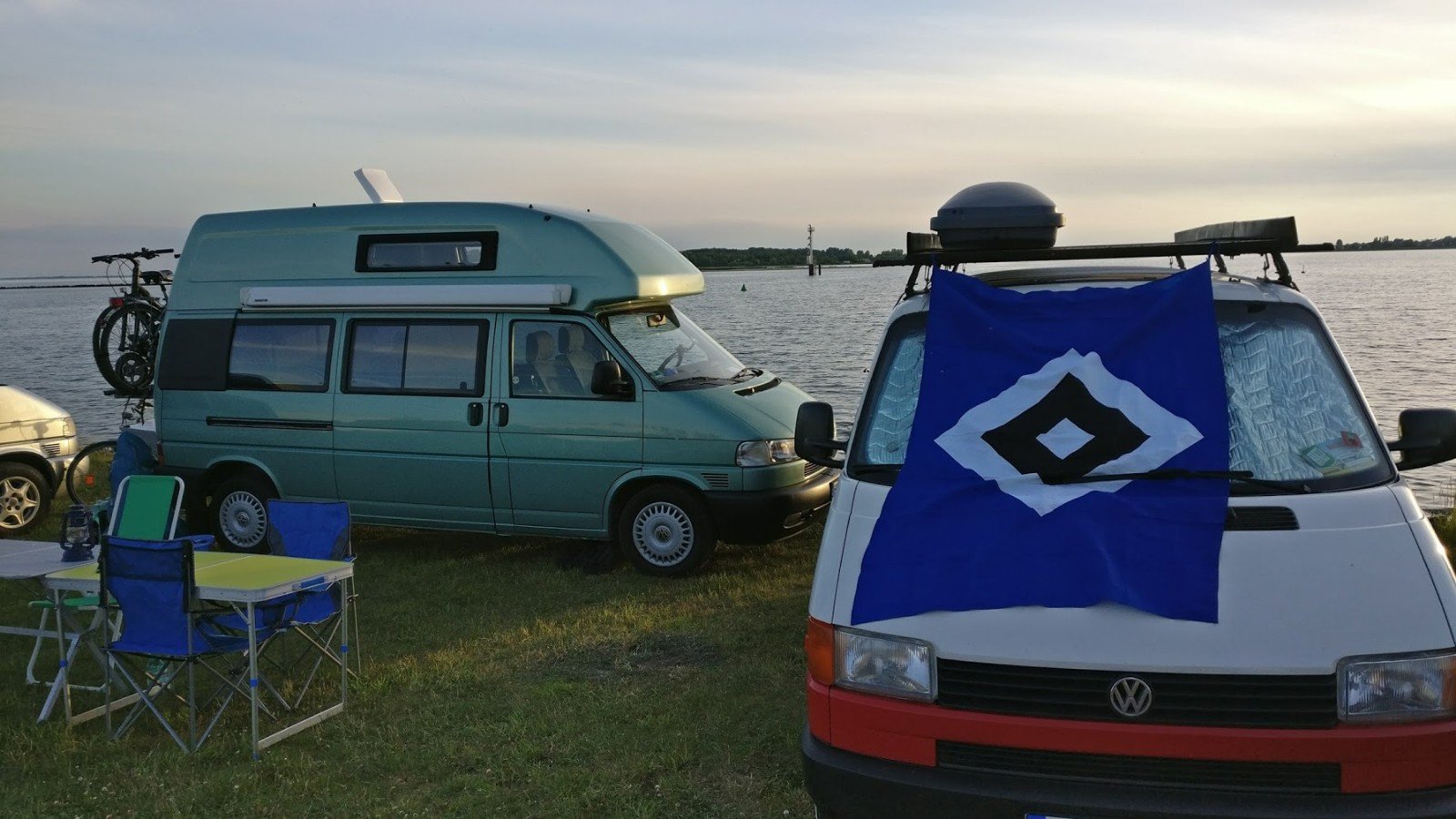 eine kleine Familie erkundet die Welt mit ihrem Bulli